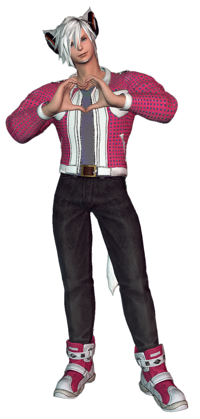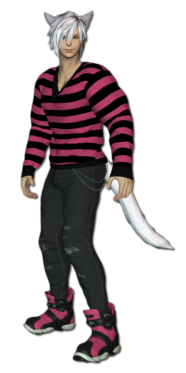 Kit is typically high-energy and aloof. He loves to flirt, make people laugh, be the center of attention, and just have a good time - even if he has to create it. He can be sarcastic at times, especially if he's annoyed, but very rarely has a bad thing to say about anyone. The claws, however, will come out if you do something to deserve them.He loves to dance - you'll often find him cruising around the various venues looking for good music and a huge dance floor. He tries to spend as much time as he can on the beaches of Eorzea, soaking up the sun and playing volleyball. He loves food, especially the street food of Kugane, and will stop whatever he's doing if his nose picks up something irresistible.He's also obsessed with clothing - often more than willing to be daring and provocative with his style. He prides himself on being an early adopter of new looks before they become mainstream. While he certainly loves to dress up for whatever occasion he finds himself in, he's also a huge fan of undressing as well. When it comes to clothing, in Kit's opinion, the more skin it shows and the easier it is to remove, the more likely he is to wear it.