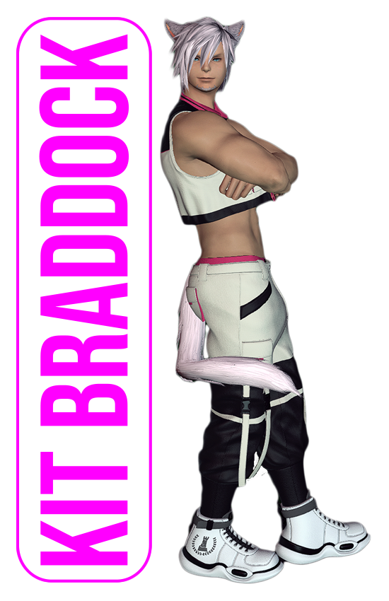 Though a reasonably skilled hunter growing up, R'kitchi Tia began to eschew his nomadic upbringing as a teenager when he grew more and more intimate with the ways of city life that encroached upon tribal lands. His curiosity eventually brought him to the gates of Ul'Dah where he managed to pick up odd jobs working for a Hyur merchant, Darwin Braddock.Before long, he found that he had a knack for negotiating on Darwin's behalf as a retainer, using his wit, charm, and disarming smile to get the best quality merchandise and prices amongst the markets of Eorzea for his employer. As word of his skills spread, he found his services in demand and began working for several merchants, earning a modest living which provided the types of comfort his nomadic lifestyle could never have offered him. In time, he moved away from using his conventional Miqo'te name and adopted the surname of his employer and mentor - Kit Braddock was born.He developed a taste for clothing spending so much time wandering through wares while on the clock and quickly began to amass a rather large and varied wardrobe. He also grew to love food, his palate ever expanding thanks to the wide variety of food to sample wherever his travels took him. When the workday was done, he and his fellow retainer friends would spend their hard earned gil partying the night away, dancing and enjoying the nightlife of the realm.Recently, Kit has taken a position working for Harry Oldman, brewmaster and owner of Steamworks Brewery in Shirogane, as a retainer, part-time helper around the bar, and apprentice brewer. Moving to Hingashi has been the highlight of Kit's young life so far - between the nightlife, fashion, and street food, he's grown quite content with his new home and looks forward to his future there and beyond.